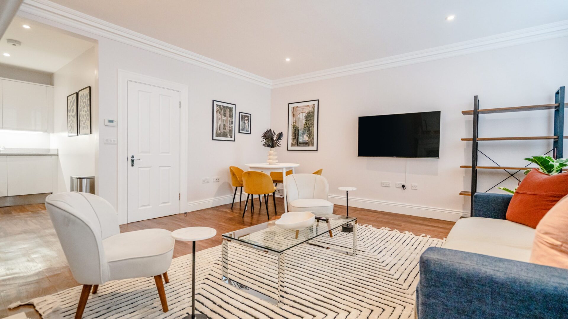 This apartment is situated on the second floor of a converted London townhouse. The space features a large kitchen & dining area, bedroom and ensuite bathroom. The carpeted bedroom features plenty of storage space, with an additional separate changing room for guests who refuse to travel light. The apartment enjoys over 60 square metres of space – well above average for an apartment in this part of the city, and comfortably enough room for two people.