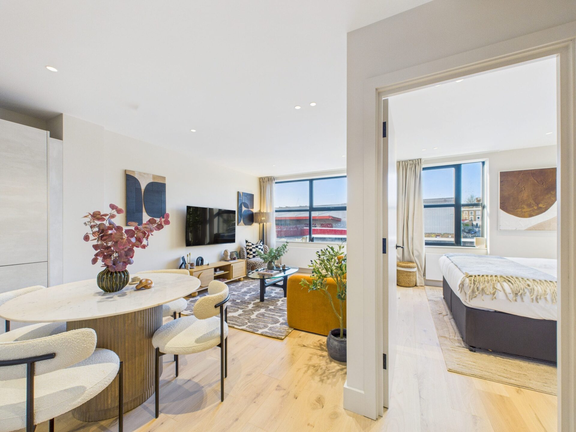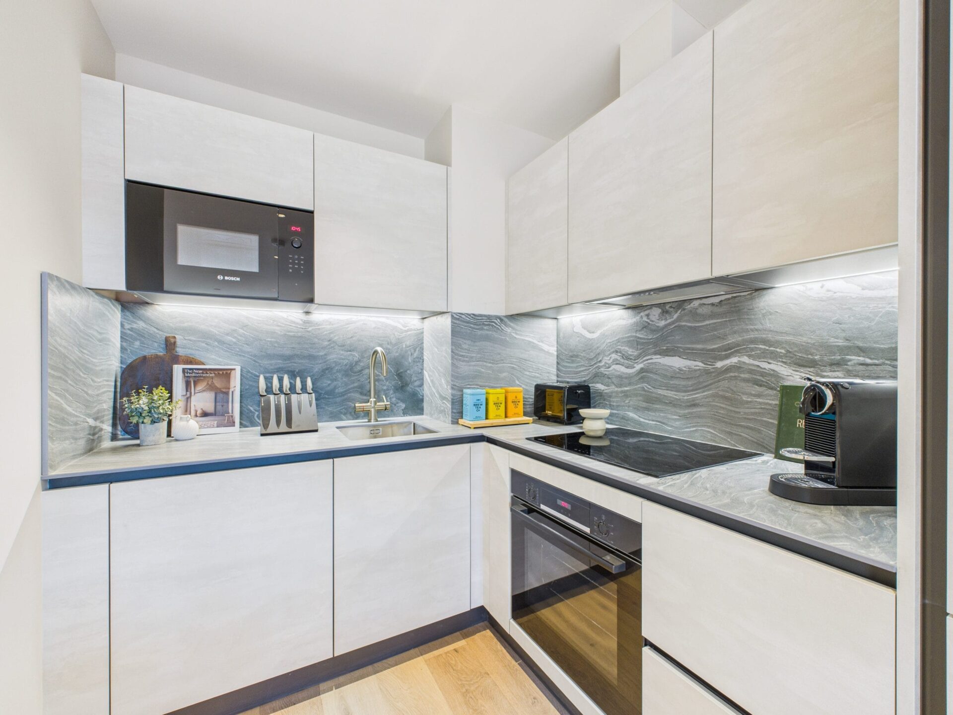 This charming apartment is located on the upper-ground floor of a modern apartment building, with elevator access. The open plan living area and fully fitted kitchen enjoys all the modern conveniences one might ask for. A smart TV, comfortable seating area, and fully-fitted kitchen including a Nespresso Coffee Machine and full-size appliances, creating a relaxing and convenient environment. The bedroom is fitted with a superking-size bed (which can be converted into twin beds upon request). The sleek bathroom features a bathtub and shower, elegant fixtures and a contemporary design