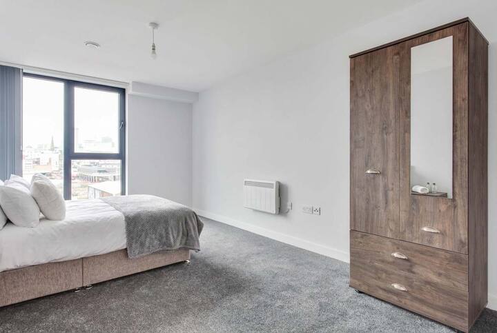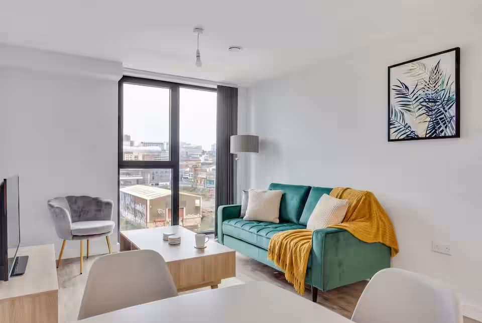A stylish, bright apartment finished to a high standard, offering a spacious open-plan layout. The living space features a dining table, comfortable sofa seating, and a Smart TV, seamlessly connecting to a modern, fully equipped kitchen—perfect for preparing meals at home. The spacious bedroom includes a a comfortable double bed, bedside tables, and ample clothing storage. The modern bathroom is fitted with a bathtub and overhead shower, with fresh towels and complimentary toiletries provided.