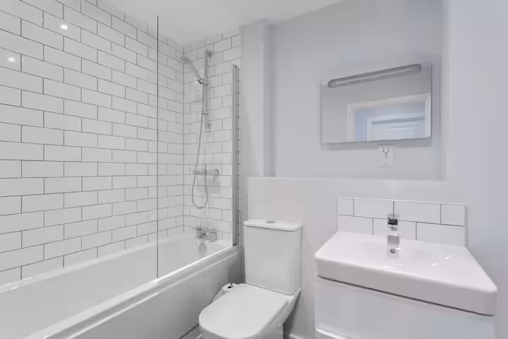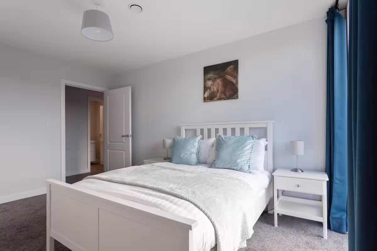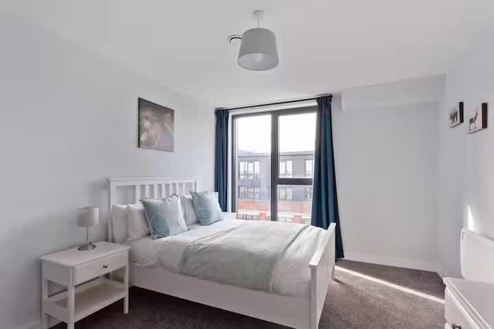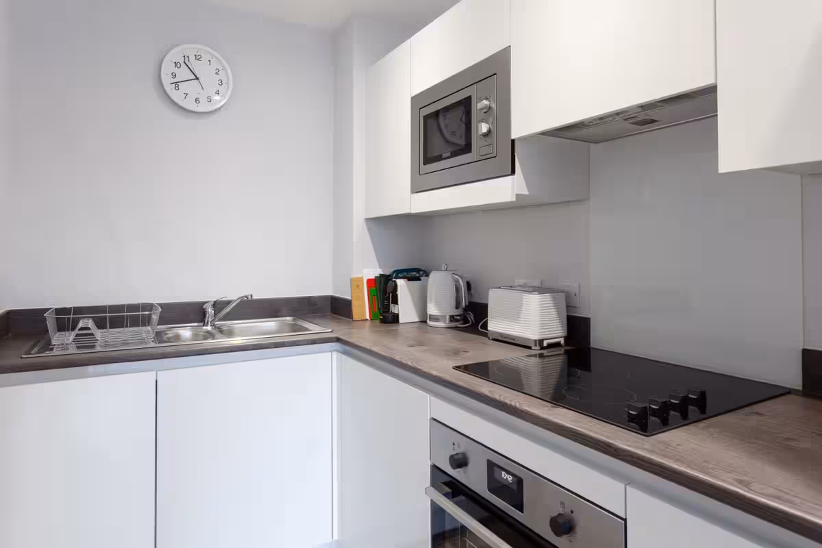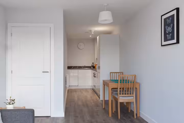 A contemporary city apartment designed for an easy, comfortable stay—light-filled interiors, clean lines, and everything set up for relaxing evenings or working remotely. – Floor-to-ceiling windows for plenty of natural light – Open-plan lounge + dining area – Fully equipped kitchen with dishwasher – Dining table for meals or laptop time – TV and comfortable sofa – Washer for longer stays – Lift/elevator access (single-level home) – Communal roof terrace access