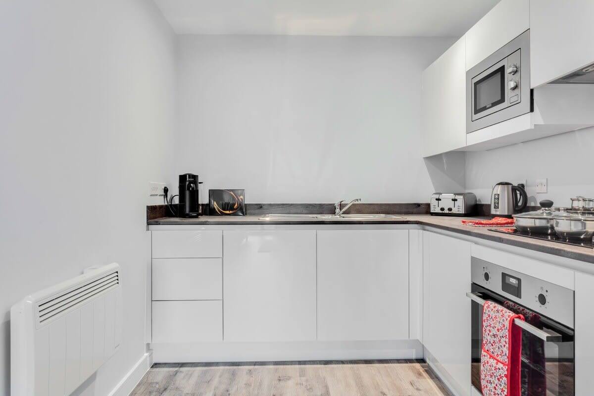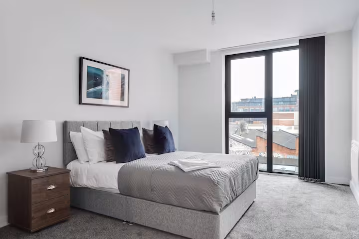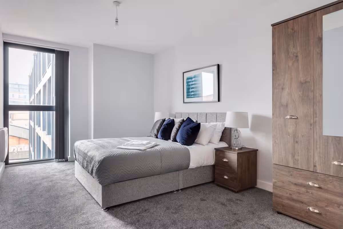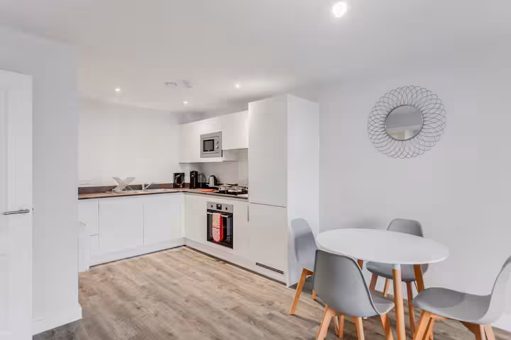 A spacious, modern apartment finished with clean lines and contemporary furnishings. The open-plan living area brings together the kitchen, dining table, and lounge—great for relaxing after a day in the city. – Living area: large sofa, TV, floor-to-ceiling windows – Dining: table for meals or planning your day – Kitchen: modern setup with key appliances and cookware – Bathrooms: two modern bathrooms for added privacy and convenie