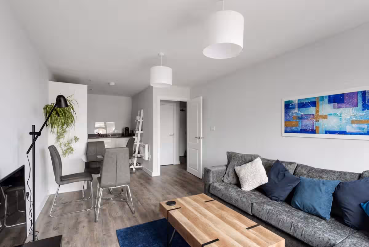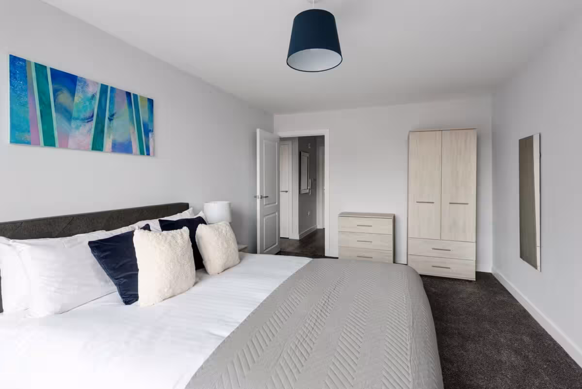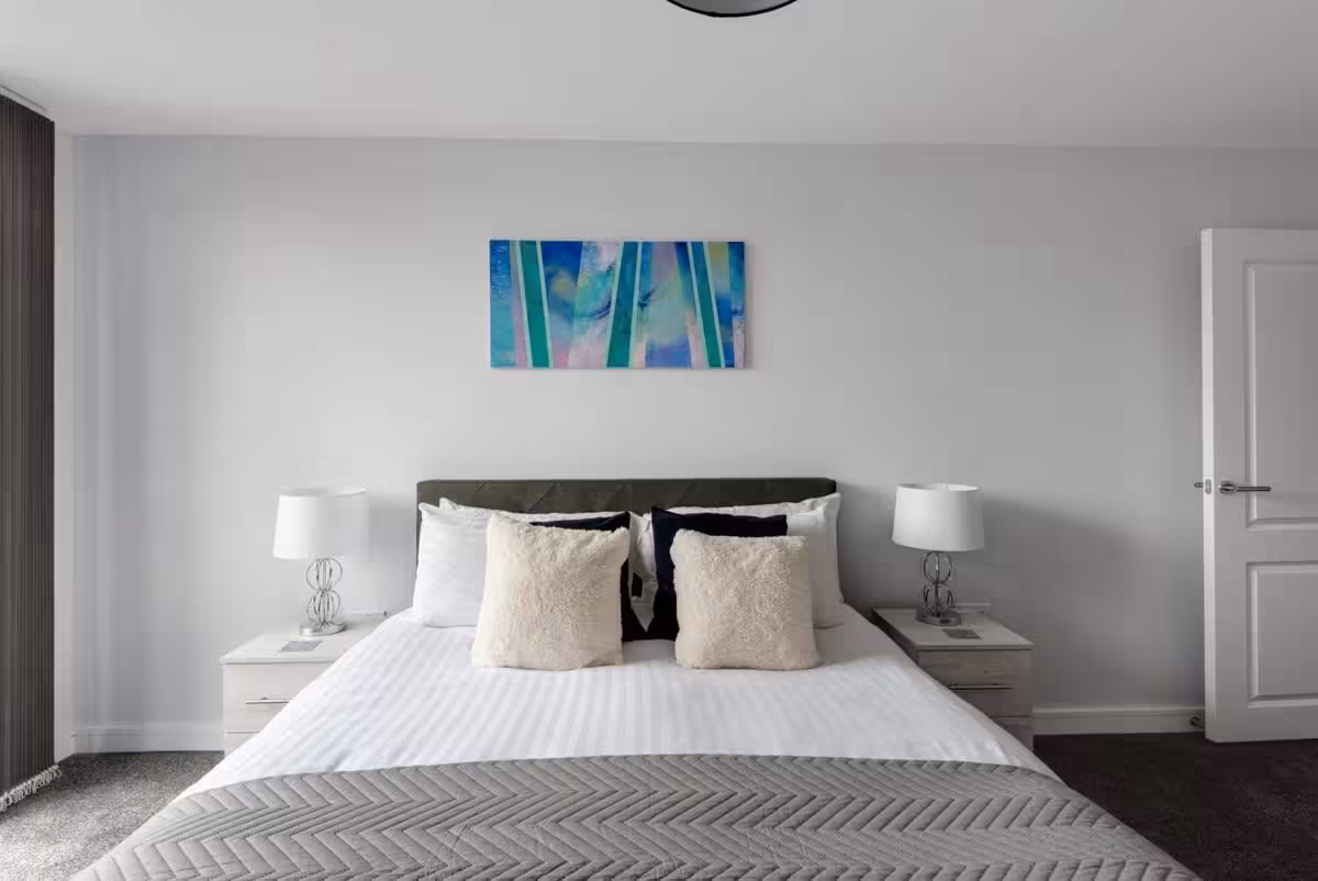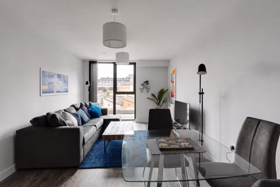 This modern one-bedroom apartment in central Birmingham features floor-to-ceiling windows, stylish furnishings, and all the essentials for a comfortable stay. Enjoy a fully equipped kitchen, smart TV, Wi-Fi, a spacious double bedroom with en-suite plus an additional bathroom. Just 10 minutes’ walk to New Street Station and 2 minutes to the coach station, it’s the ideal city base.