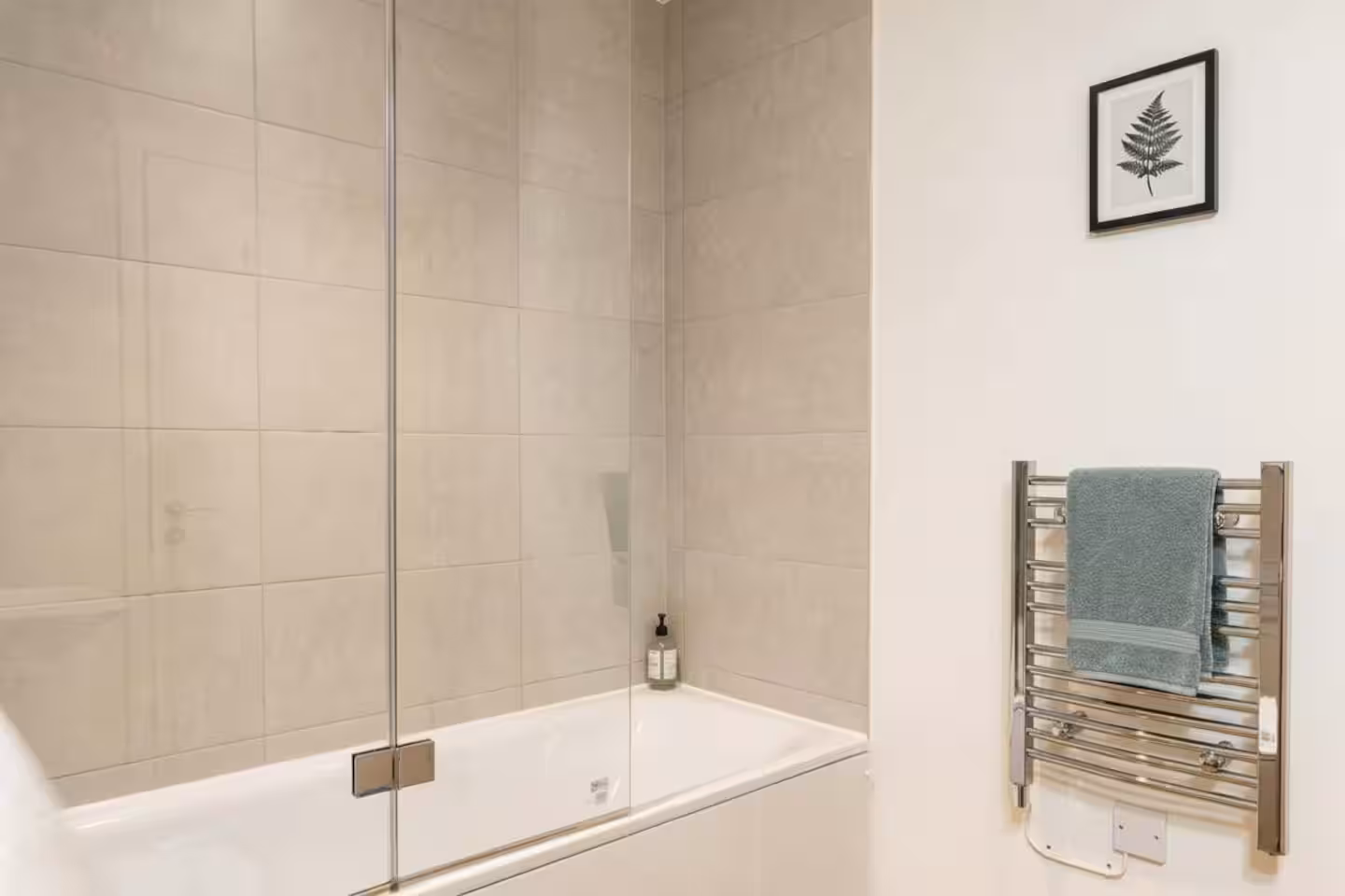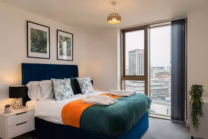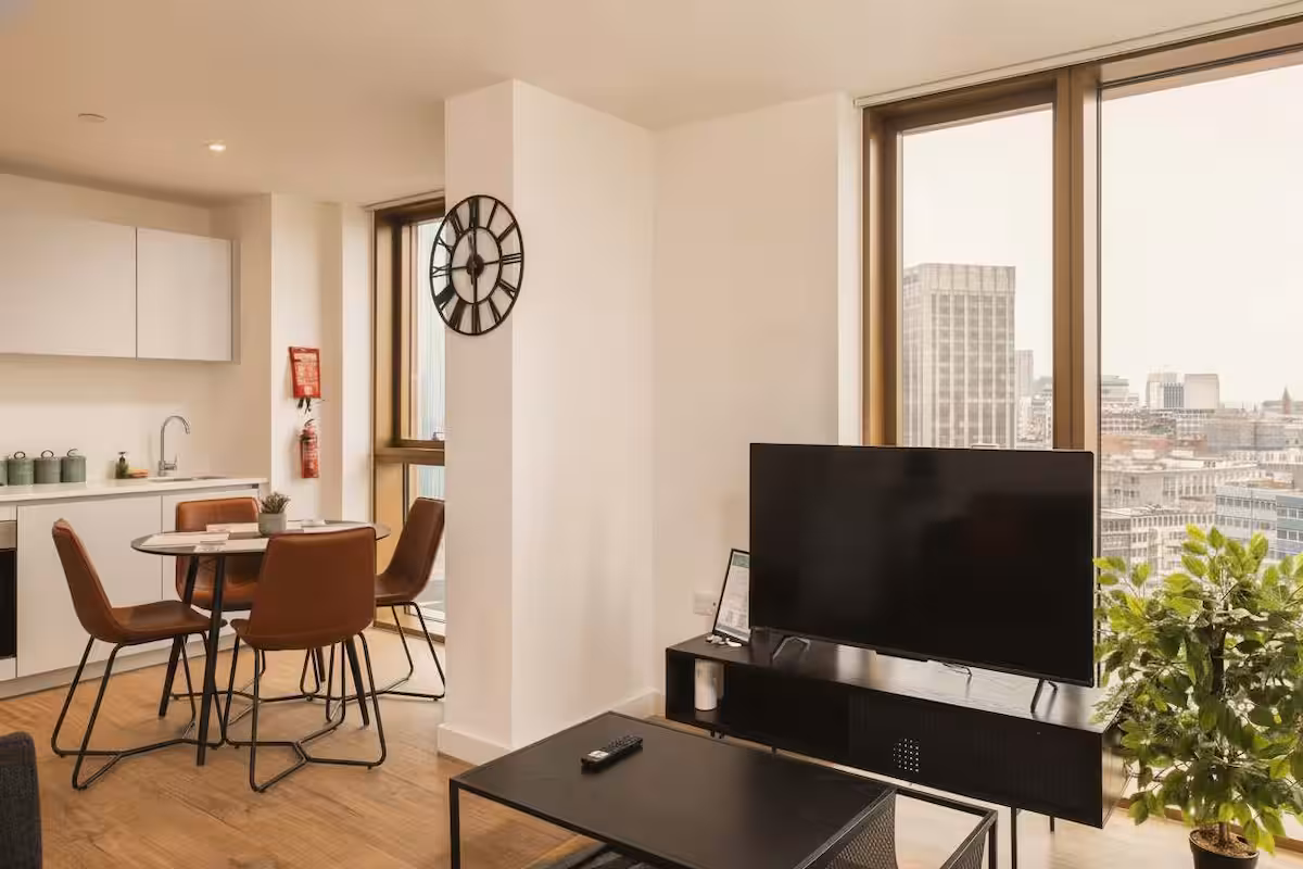 The beautifully designed interior is finished to an exceptional standard, with stylish décor, contemporary fittings, and plenty of space for up to four guests to relax in comfort. Floor-to-ceiling windows flood the apartment with natural light and showcase impressive city views from the 14th floor. The spacious open-plan living area features a fully equipped kitchen ideal for preparing meals, as well as a large sofa, armchair, and smart TV. High-speed broadband is available throughout.