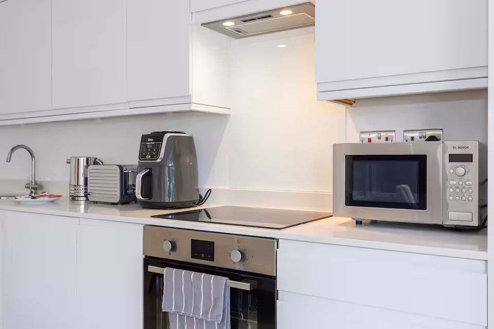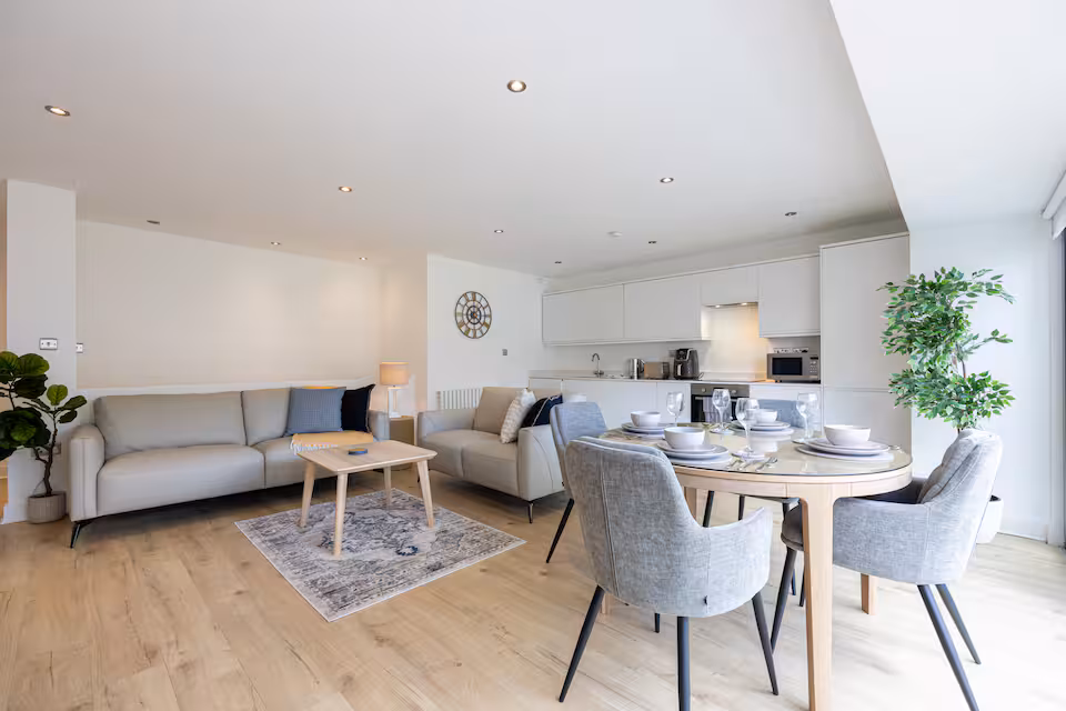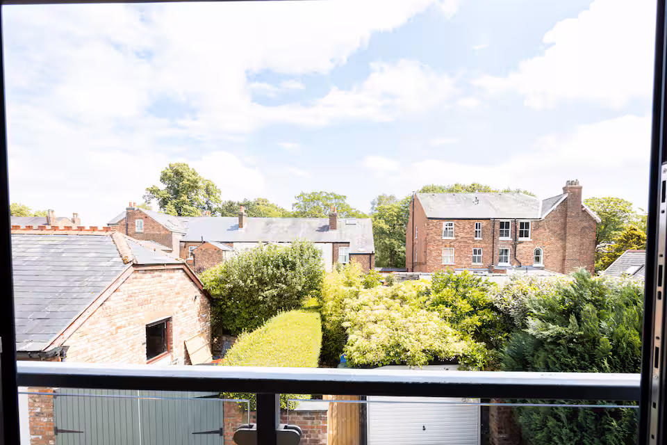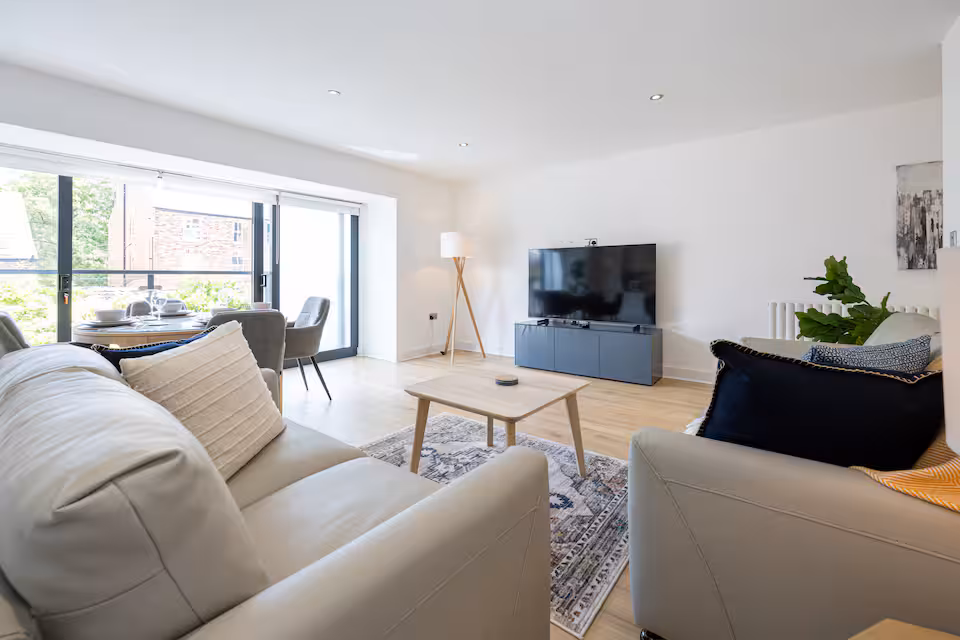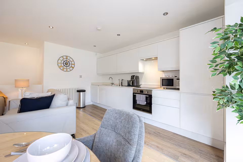 This stylish apartment is nestled in the heart of Cheadle Village. Upon entering, you’ll find a spacious double bedroom with en suite on the ground floor. Upstairs, the open plan lounge, dining area, and fully equipped kitchen create a bright, welcoming space, enhanced by large bi fold doors. The kitchen includes modern amenities like an air fryer for a true home from home experience. The first floor also features a sleek bathroom with a bathtub and shower, plus an additional double bedroom